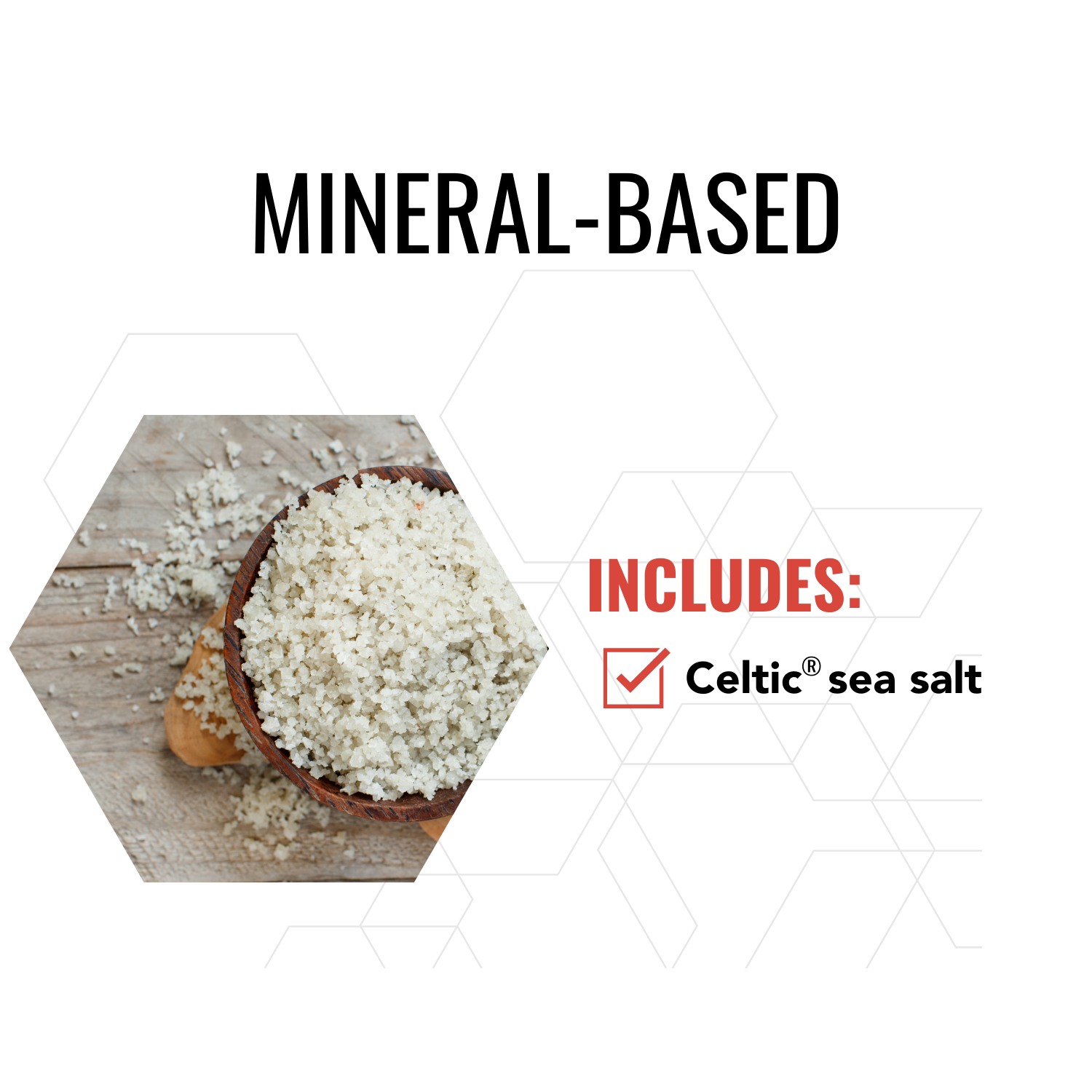- Celtic® Sea Salt: A hand-harvested, unprocessed sea salt containing 82 minerals and trace elements, including three forms of the essential mineral, magnesium (chloride, bromide, and sulfate), as well as the ideal balance of sodium and potassium. These forms of magnesium, plus the ratios of sodium and potassium, are responsible for expediting hydration at the cellular level.