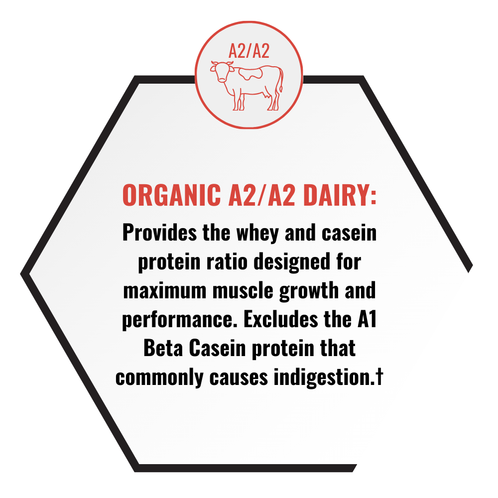 - Organic A2/A2 dairy provides both whey protein and casein protein in ratios designed to be similar to mother’s milk, providing easily digestible fuel that encourages maximum muscle growth and performance.†