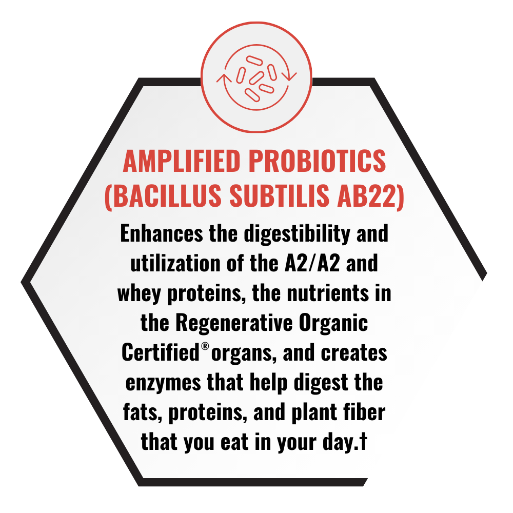- Amplified Probiotics (Bacillus subtilis AB22) further enhance the digestibility and utilization of the A2/A2 and whey proteins, as well as the nutrients that are abundant in the Regenerative Organic Certified® organs. In addition, these Amplified Probiotics create enzymes that will help you digest the fats, proteins, and plant fiber that you eat throughout the day.†
