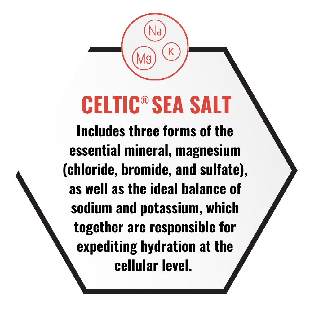 - Celtic® Sea Salt: A hand-harvested, unprocessed sea salt containing 82 minerals and trace elements, including three forms of the essential mineral, magnesium (chloride, bromide, and sulfate), as well as the ideal balance of sodium and potassium. These forms of magnesium, plus the ratios of sodium and potassium, are responsible for expediting hydration at the cellular level.
