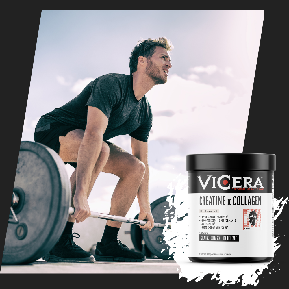 ViCera Creatine x Collagen powder is a REVOLUTIONARY formulation that combines the power and potency of creatine monohydrate, hydrolyzed eggshell membrane collagen, and Regenerative Organic Certified® grass-fed bovine heart, a natural source of creatine, collagen, and more. It is a potent combo that provides energy, supports muscular strength and endurance, improves exercise recovery, promotes healthy joints, ligaments and tendons, and supports a healthy inflammation response.†